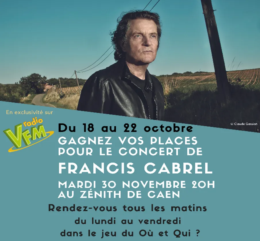 RadioVFM vous invite au concert de Francis Cabrel le mardi 30 novembre au Zénith de Caen, jouez et gagnez vos places en écoutant RadioVFM tous les matins !